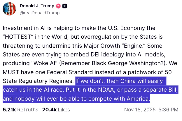 Heute hat Präsident Donald Trump angekündigt, dass er in Kürze eine Durchführungsverordnung unterzeichnen wird, die einheitliche Bundesvorschriften für Technologie- und KI-Unternehmen schafft, wodurch alle diese Gruppen die individuellen Vorschriften in allen 50 Bundesstaaten umgehen können, und dass er diese Technologieunternehmen mit Genehmigungen unterstützen wird, wann und wie immer sie es wünschen.