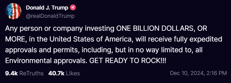 „Jede Person oder jedes Unternehmen, die bzw. das EINE MILLIARDE DOLLAR ODER MEHR in den Vereinigten Staaten von Amerika investiert, erhält vollständig beschleunigte Genehmigungen und Zulassungen, einschließlich, aber keineswegs beschränkt auf alle Umweltgenehmigungen. MACHEN SIE SICH BEREIT FÜR DEN GROSSEN DURCHSTART!!!“