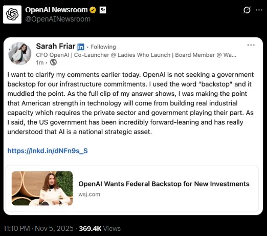 Es gab auch zahlreiche Gerüchte, dass sie sehr bald eine Rettungsaktion benötigen werden. Sarah Friar, CFO von OpenAI, sagte bei einer Veranstaltung des Wall Street Journal, das Unternehmen suche „eine Absicherung, eine Garantie, die die Finanzierung ermöglicht, die die Finanzierungskosten wirklich senken, aber auch den Beleihungswert erhöhen kann, also den Betrag, den man zusätzlich zum Eigenkapital aufnehmen kann”. Nachdem ihre Äußerungen viral gegangen waren, musste sie diese zurücknehmen.