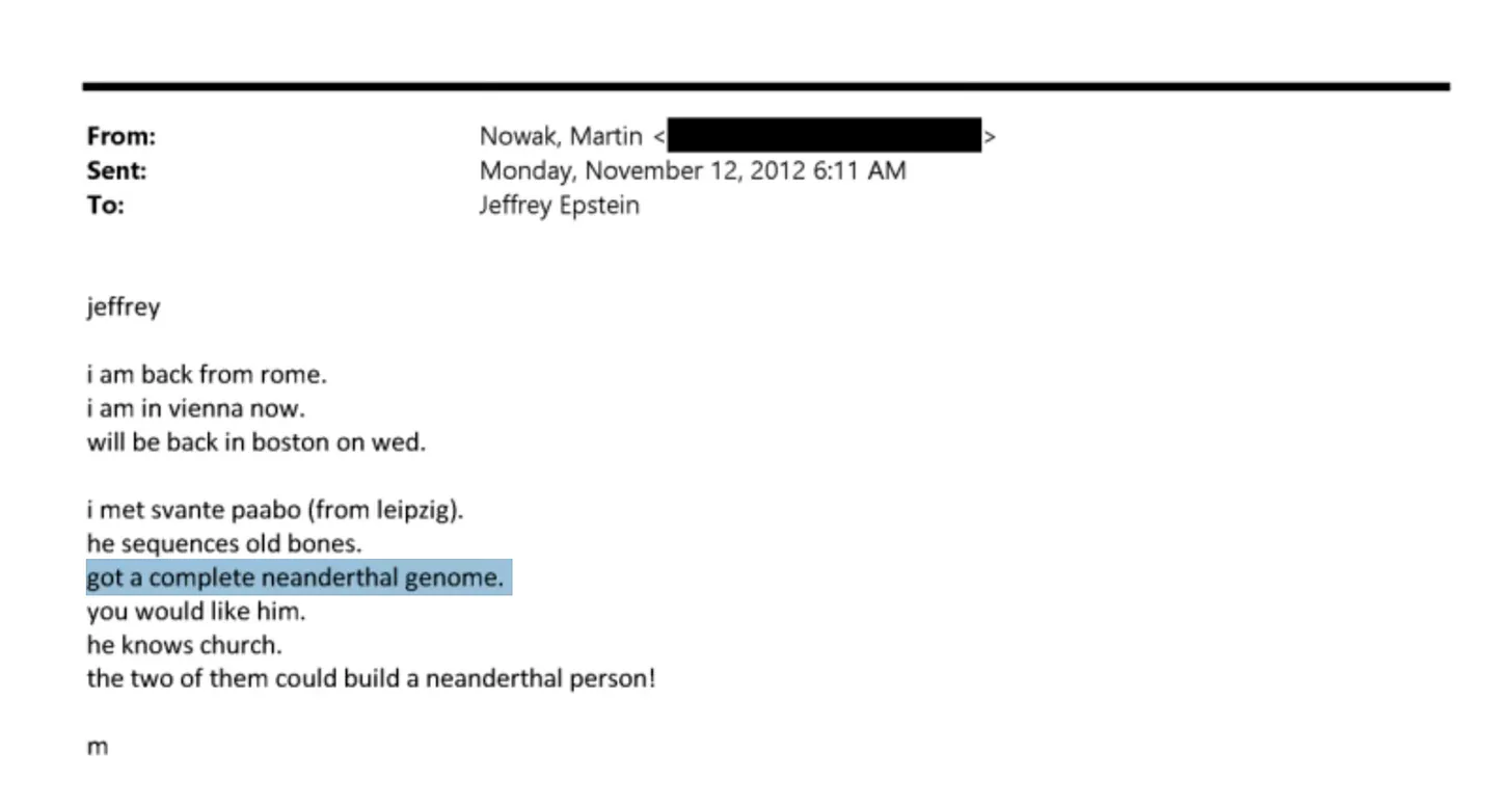 Martin Nowak – Professor für Mathematik und Biologie in Harvard, Direktor des Programms für Evolutionsdynamik und später nach eigenen Angaben durch Epstein zu einer CRISPR-Kooperation mit Churchs Labor „veranlasst“ – schrieb am 12. November 2012 aus Wien an Epstein und berichtete von einem Treffen mit Svante Pääbo, dem Direktor des Max-Planck-Instituts für evolutionäre Anthropologie in Leipzig. Nowak beschrieb Pääbo in drei Zeilen: „Er sequenziert alte Knochen. Hat ein vollständiges Neandertaler-Genom. Er würde Ihnen gefallen.” Dann fügte er hinzu: „Er kennt Church. Die beiden könnten einen Neandertaler erschaffen!”