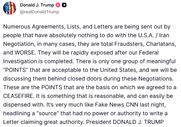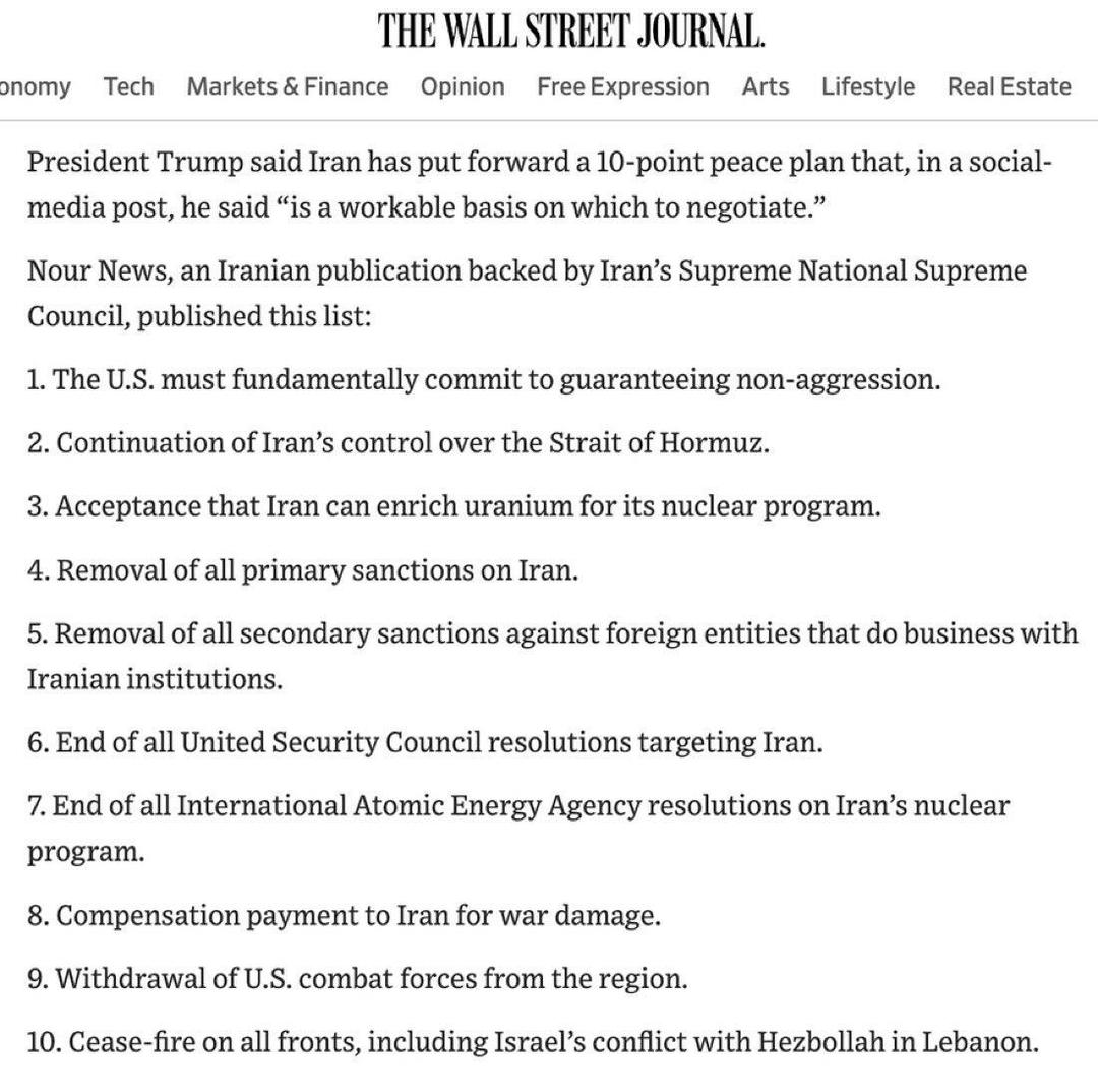 Der Iran hat gegenüber Trump seine „Zustimmung“ bekundet, dass der vorgeschlagene 10-Punkte-Plan für einen Waffenstillstand durchführbar sei, hat jedoch gleichzeitig über Parlamentspräsident Ghalibaf eine offizielle Erklärung abgegeben, in der beanstandet wird, dass drei zentrale Klauseln bereits verletzt worden seien. Diese betreffen: