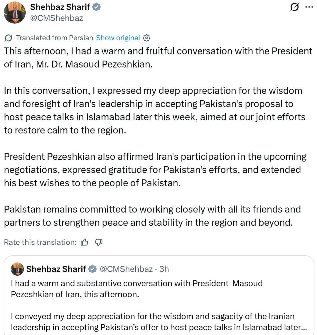Über ein Gespräch mit dem iranischen Präsidenten sagte er: „Ich habe meine tiefe Wertschätzung für die Weisheit und Weitsicht der iranischen Führung zum Ausdruck gebracht, die Pakistans Vorschlag angenommen hat, später in dieser Woche Friedensgespräche in Islamabad auszurichten, die auf unsere gemeinsamen Bemühungen abzielen, die Ruhe in der Region wiederherzustellen. Präsident Pezeshkian bekräftigte zudem die Teilnahme des Iran an den bevorstehenden Verhandlungen, bedankte sich für Pakistans Bemühungen und übermittelte dem pakistanischen Volk seine besten Wünsche.“