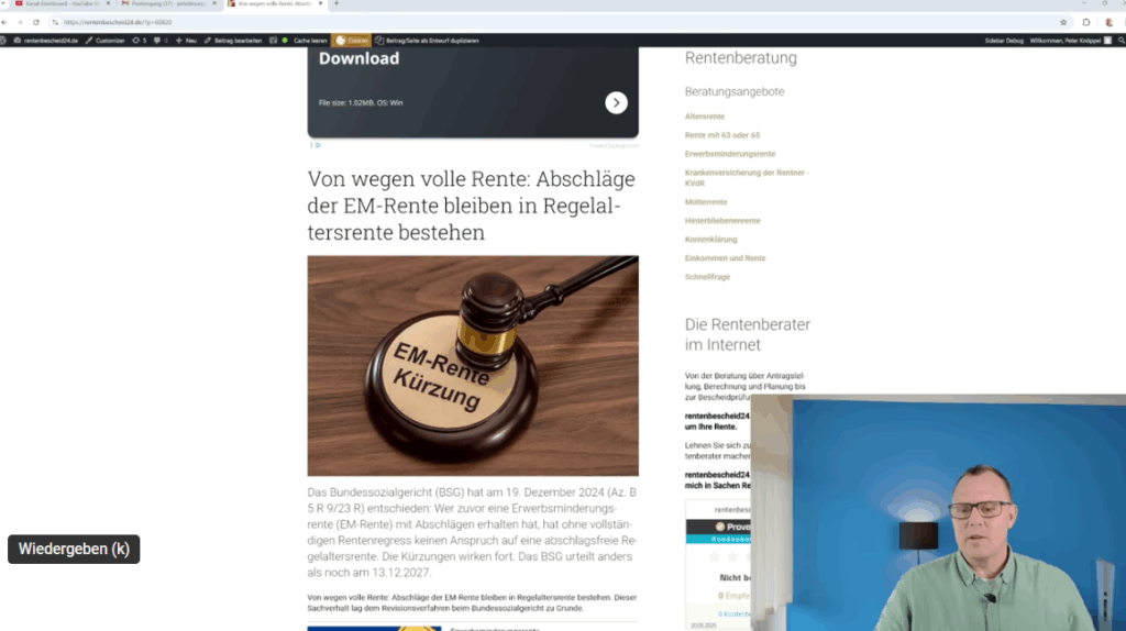 Von wegen âvolle Renteâ! đ„ Das Bundessozialgericht (BSG) hat am 19. Dezember 2024 entschieden: Wer zuvor eine Erwerbsminderungsrente (EM-Rente) mit AbschlĂ€gen bezogen hat, bekommt auch in der Regelaltersrente keine volle Auszahlung â die AbschlĂ€ge bleiben bestehen! đ In diesem Video erklĂ€rt Rechtsanwalt und Rentenberater Peter Knöppel von rentenbescheid24.de, was hinter dem Urteil steckt, warum der sogenannte Rentenregress so wichtig ist und welche Fehler der Rentenversicherung fĂŒr Betroffene teuer werden können. đ Inhalt des Videos: