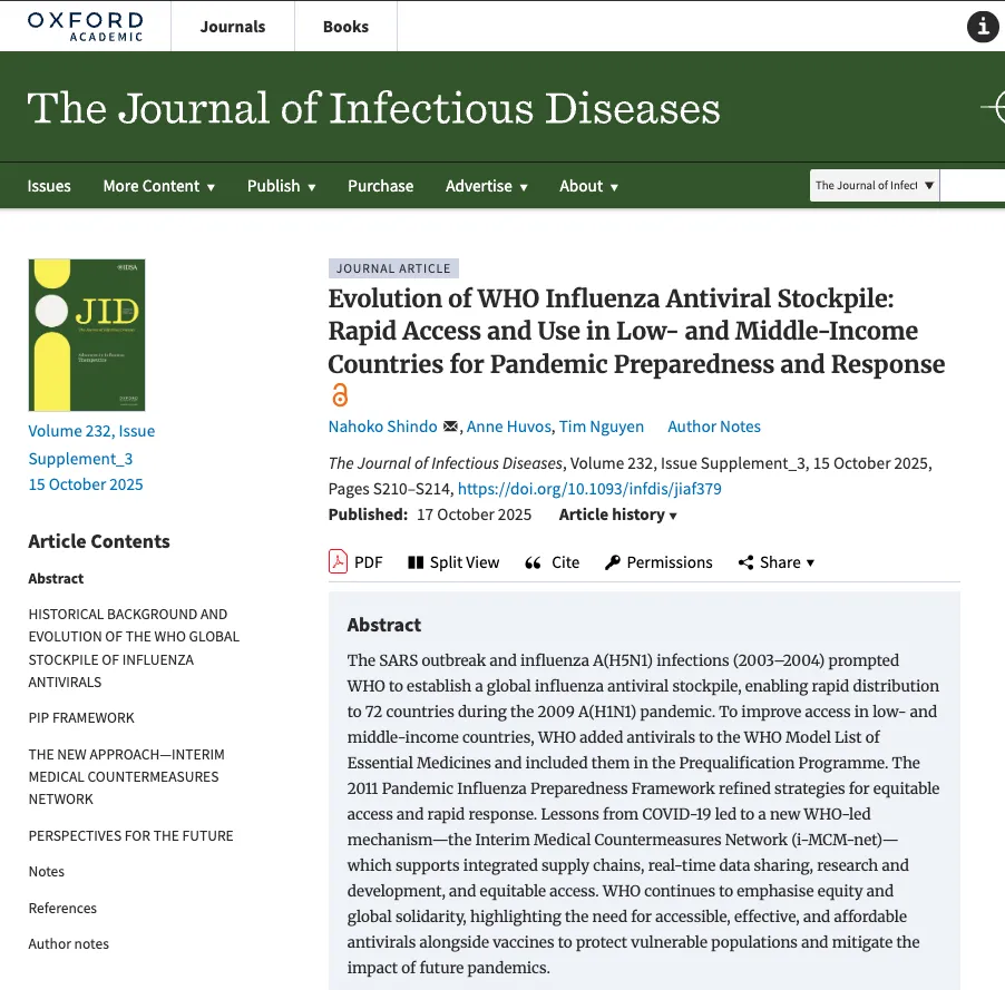 Der Artikel erklärt, dass diese Ereignisse zur Schaffung einer internationalen Vorratshaltung von antiviralen Medikamenten „für den strategischen Einsatz während eines sich ausbreitenden Ausbruchs“ geführt haben.